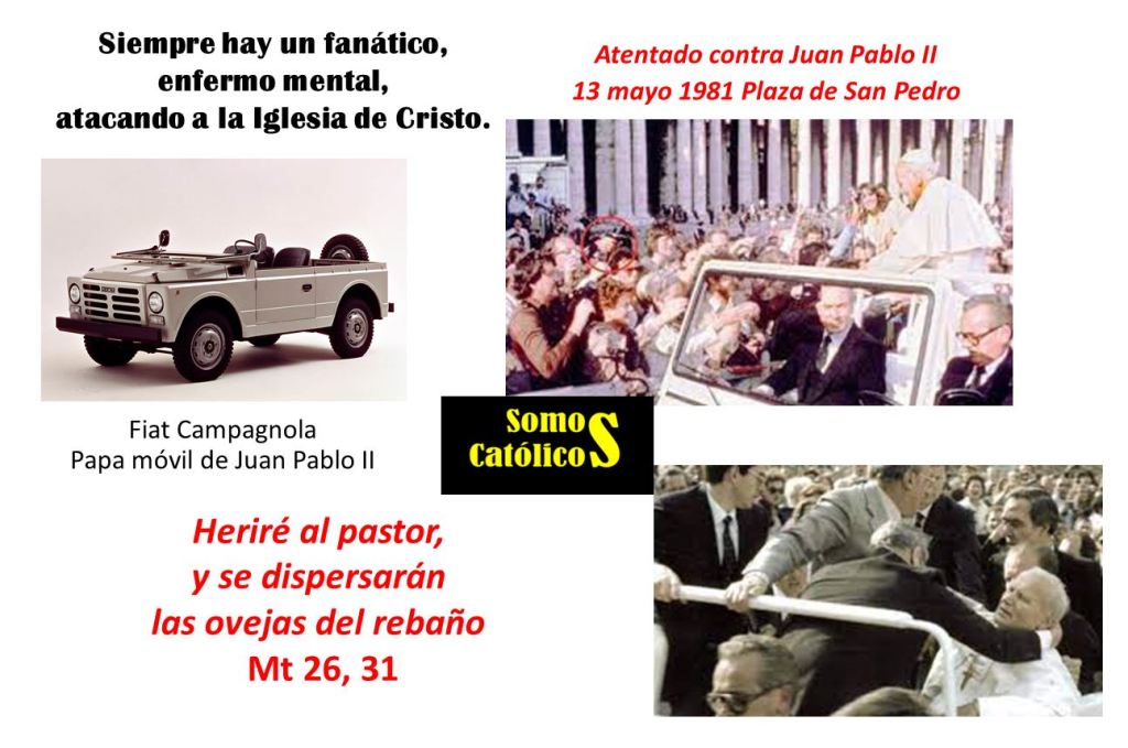 Estas amenazas de gente inculta y violenta, llegaron a su clímax, el 13 de mayo de 1981, donde un turco, estuvo a punto de asesinar a Juan Pablo II en la mismísima plaza de San Pedro, pero la Virgen María, nuestra señora de Fátima, lo cubrió con su amor de madre, según recordaría el Papa. Por esto y por muchas razones más, el papa usa un “papamóvil” en todas sus visitas pastorales y la guardia suiza, debe estar en avanzada, cuidando a cada instante la vida del sucesor de Pedro.