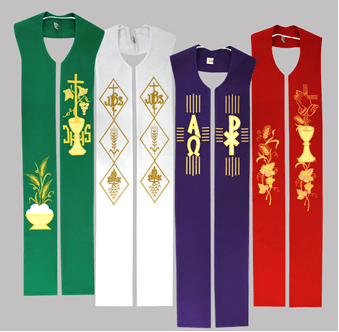 VERDE: Simboliza la esperanza. Es usado después de Navidad hasta Cuaresma, y después de la Pascua hasta el Adviento. Es tiempo de esperanza por la venida del Mesías y por la Resurrección salvadora respectivamente. Este tiempo se conoce como Tiempo Ordinario dentro del calendario litúrgico.