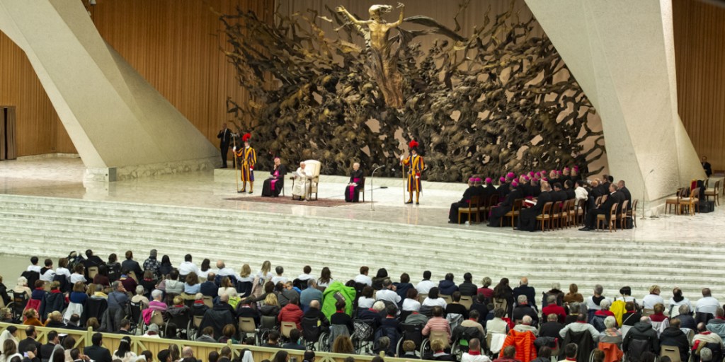 En el Vaticano existe esta aula magna, en la cual se llevan audiencias generales para auditorios grandes, más de 6 mil personas, esta es el aula Pablo VI. El Papa, recibe a miles de peregrinos semanalmente, probablemente después de una misa o una canonización y como en la plaza de San Pedro, tan majestuosa pero tan falta de un encuentro personal a la vez, pues los recibe en esta sala, se sienta al frente y tras de él, hay una escultura enorme, que, a simple vista no tiene sentido. Son como ramas retorcidas con huecos y aristas, deformes, sin simetría alguna. Al centro de las cuales se diferencia una figura humana que sobresale, puede parecer una figura fantasmal, es el centro de la obra de arte.