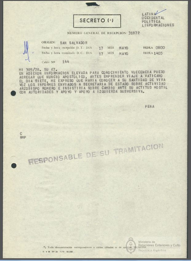 Este es un “cable” del año 1978, desclasificado recientemente por el gobierno argentino, en el cual el representante de ese país informa que el señor nuncio de El Salvador va a solicitar, en el Vaticano, el cambio de monseñor Romero.