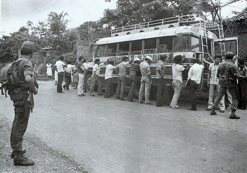 Esta fotografía junto a estas letras, era una de las estampas cotidianas en El Salvador de las décadas de los setentas y ochentas. Los famosos “retenes”, donde detenían a los autobuses del transporte colectivo, bajaban a los hombres y los registraban. En algunas ocasiones los soldados ya no dejaban subirse a los que elegían, ya que estaban en la lista que andaban buscado, estaban en reclutamiento forzoso o simplemente porque les parecían sospechosos. Y en El Salvador, ser sospechoso, era igual que ser culpable. Al siguiente día aparecían sus cadáveres en cualquier parte del país.