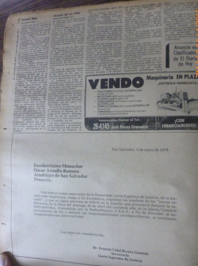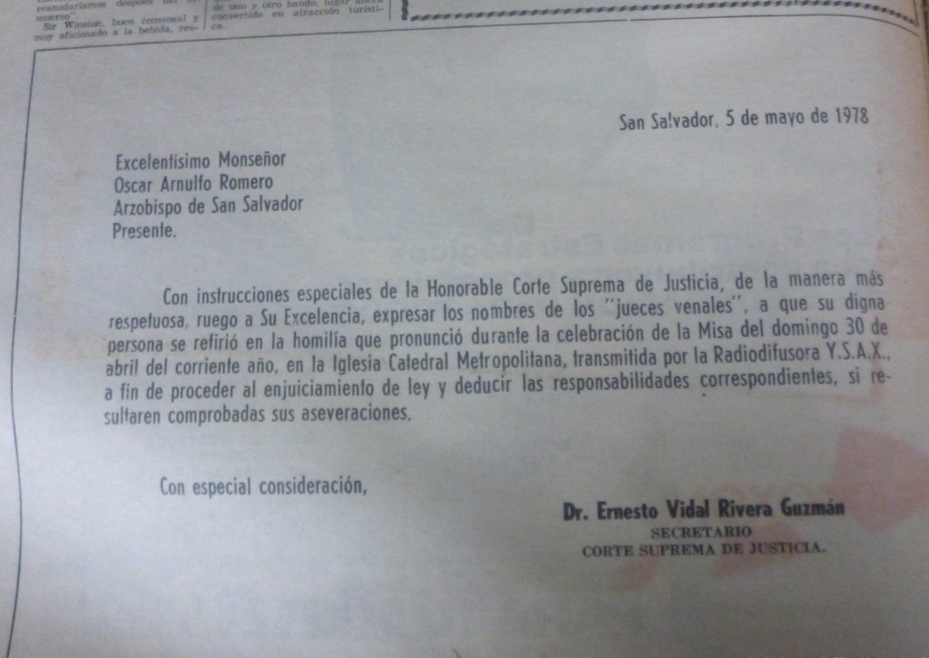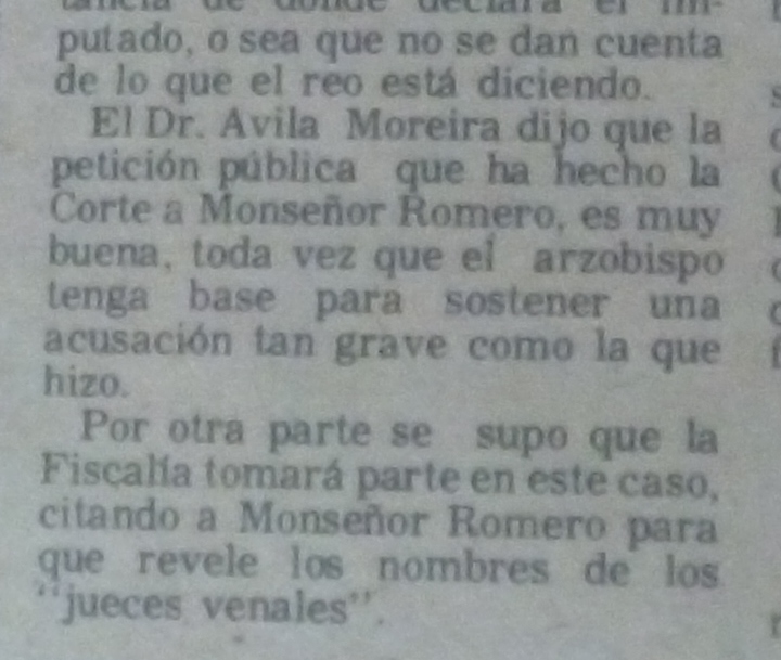 En este artículo del 10 de mayo, uno de los magistrados dijo sobre la petición de la Corte Suprema de Justicia que “la petición pública que ha hecho la Corte a Monseñor Romero es muy buena, toda vez que el arzobispo tenga base para sostener una acusación tan grave como la que hizo… La Fiscalía tomará parte en este caso, citando a monseñor Romero para que revele los nombres de los jueces venales”[2]